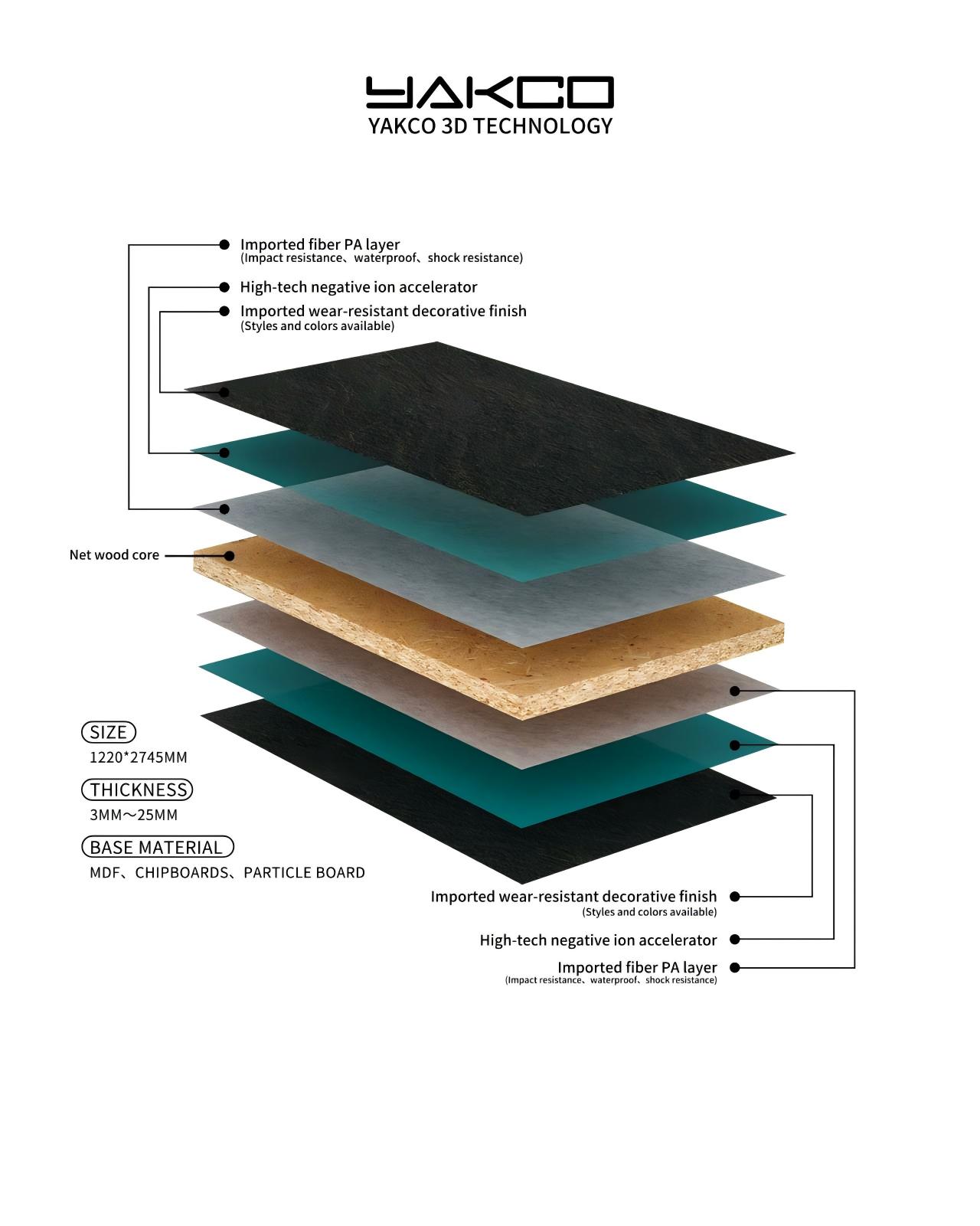 Olipa kyseessä luonnolliset kuviot, kuten puun syyt tai kivikuviot, tai abstraktit geometriset kuviot ja taiteelliset kuviot, kaikki voidaan renderöidä elävästi 3D-tekniikan avulla, mikä tarjoaa suunnittelijoille laajemman luovan tilan erilaisiin suunnitteluvaatimuksiin. Niitä voidaan käyttää muun muassa sisäseinien, väliseinien koristeluun, huonekaluihin ja kaappipintoihin.